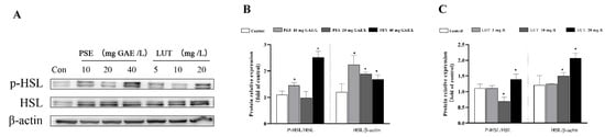 HSL is the rate-limiting enzyme for lipid hydrolysis, and HSL phosphorylation plays a key role in the lipolysis process. As shown in Figure 7A, we measured the protein levels of phosphorylated HSL using Western blot. The results indicate that 20 mg GAE/L PSE and 5 mg/L LUT did not significantly promote the phosphorylation of HSL, and 40 mg/L PSE and 20 mg/L LUT significantly increased HSL phosphorylation by 127.6% and 30.5%, respectively. Interestingly, it is estimated that there is a dose–effect relationship between LUT concentration and HSL phosphorylation expression. The expression levels of HSL protein increased by 85.2%, 30.3% and 25.5%, respectively, after 10, 20 and 40 mg GAE/L PSE treatment. The protein expression of HSL was also increased to varying degrees in LUT treatment.