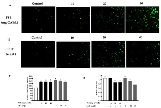 The effect of PSE and LUT on the mitochondrial biogenesis of fully differentiated 3T3-L1 adipocytes after 48 h. (A) Mito Tracker Green staining of fully differentiated 3T3-L1 adipocytes treated with different PSE concentrations (0 mg/L, 10 mg/L, 20 mg/L and 40 mg/L) at 200× magnification. (B) Mito Tracker Green staining of fully differentiated 3T3-L1 adipocytes treated with different LUT concentrations (0 mg/L, 5 mg/L, 10 mg/L and 20 mg/L) at 200× magnification. Scale bar = 200 μm. (C) Quantified via the fluorescence intensity measuring of the mitochondrial mass. (D) The intracellular ATP level. The data are presented as the mean ± SD from three independent experiments. * Significant differences are indicated by p < 0.05.