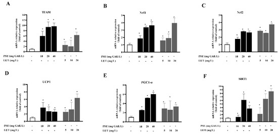 PSE and LUT modulated the expression of the core browning gene in the 3T3-L1 adipocytes. The relative mRNA expressions of (A) TFAM, (B) Nrf1, (C) Nrf2, (D) UCP1, (E) PGC1-α, and (F) SIRT1. The data are presented as the mean ± SD from three independent experiments. * Significant differences are indicated by p < 0.05.