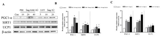 PSE and LUT modulated the expression of core browning protein markers. (A) Western blot results for the browning proteins. The quantification of PGC1-α, SIRT1, UCP1 after (B) PSE and (C) LUT treatment. The data are presented as the mean ± SD from three independent experiments. * Significant differences are indicated by p < 0.05.