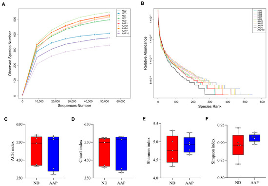 As shown in Figure 1A, the dilution curves of the ND and AAP groups gradually smoothed out, indicating that the species in the intestinal tract were not enhanced by the increase in the number of sequenced samples, which in this study was sufficient to reflect the flora characteristics of the samples. The rank-abundance curve visually reflected the abundance and uniformity of the species. Dietary supplementation with AAP did not destroy the homeostasis of the intestinal flora species in the mice (Figure 1B); however, there were no statistically significant differences in the Chao1, ACE, Shannon, or Simpson indexes (Figure 1C–F).