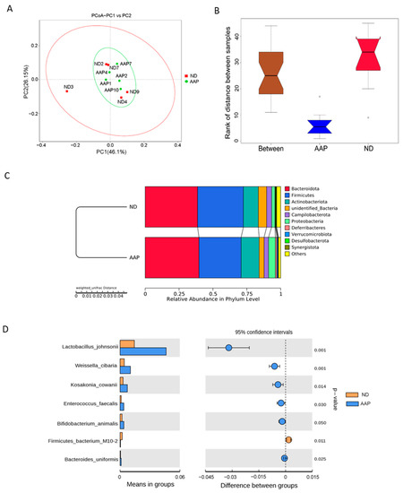 β diversity mainly describes the changes in species composition on a spatial scale to evaluate the similarity between the groups; it can be analyzed by PCoA, which can visually show the similarities and differences in microorganisms in differently treated samples. As illustrated in Figure 2A, the intestinal microbial structure of the ND and AAP groups were similar, indicating that dietary supplementation of AAP did not markedly change the β diversity of the intestinal microbes. The box diagram for the group difference analysis among β diversity is shown in Figure 2B. The median, maximum and minimum sample values of the ND and AAP groups were different to some extent.