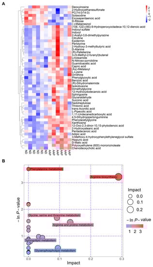 The results of screening for differential metabolites are visualized in the form of volcanic diagrams, as illustrated in Figure 3E,F. Each point in the diagram represents a metabolite. The abscissa represents multiple changes within a group in comparison to between groups (the logarithm with 2 as the bottom), and the ordinate represents the p-value of the Student’s t test (the negative number of the logarithm with 10 as the bottom). The scatter point size represents the variable importance projection (VIP) value of the OPLS-DA model. The larger the scatter point, the larger the value. The scatter colors represent the final screening results, with significantly up-regulated metabolites in red, significantly down-regulated metabolites in blue, and non-significantly different metabolites in grey. Substances that met the following requirements were identified as differential metabolites: (1) VIP value > 1; (2) significant difference p < 0.05; (3) exclusion of heterologous metabolites according to the references. The results showed that a total of 51 differential metabolites were screened out as potential biomarkers in the mice serum after the AAP dietary supplement. Of these, 1–20 were in positive ion mode and 21–54 were in negative ion mode. L-lysine, citrulline and indophenol sulfate were detected in both modes. Details of the selected biomarkers are shown in Table 1.