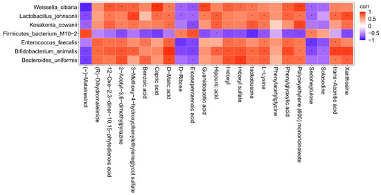 Correlation analysis between characteristic bacteria and metabolites. corr = correlation. Red represents positive correlation and blue represents negative correlation. The deeper the color, the greater the correlation. * indicates p < 0.05.