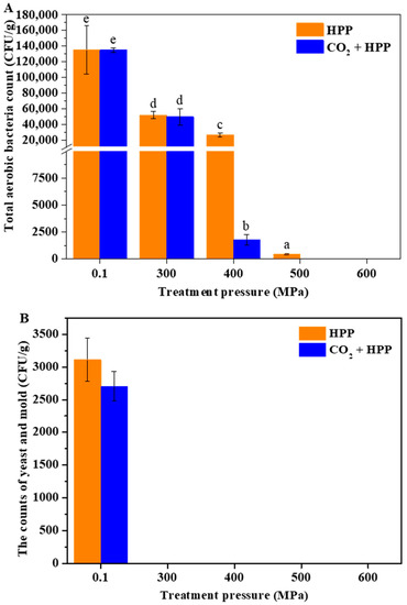 Effects of HPP and CO2 + HPP treatments with different pressures on total aerobic bacteria (A) and yeast plus mold (B) counts of DFP. Different letters (a, b, c, etc.) indicate significantly different means at p < 0.05 (analysis of variance (ANOVA)).