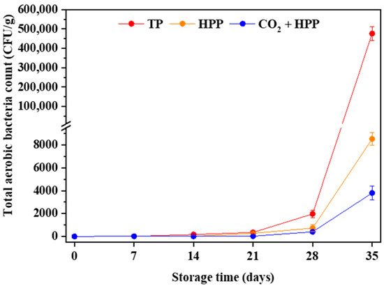 Effects of TP (95 °C, 60 min), HPP (600 Mpa) and CO2 + HPP (600 Mpa) treatments on total aerobic bacteria counts of DFPs during storage.
