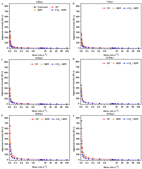 Changes in apparent viscosity of TP—(95 °C, 60 min), HPP—(600 Mpa), and (CO2 + HPP)—treated DFP (600 Mpa) during storage. (A–F) present 0, 7, 14, 21, 28, and 35 days, respectively.