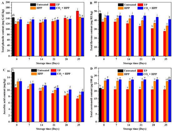 Analysis of total phenolic (A), total flavonoid (B), ascorbic acid (C), and total carotenoid (D) contents of TP—(95 °C, 60 min), HPP—(600 Mpa), and (CO2 + HPP)—treated DFP (600 Mpa) during storage. Different letters (a, b, c, etc.) indicate significantly different means at p < 0.05 (analysis of variance (ANOVA)).