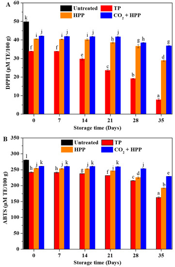 Analysis of DPPH antioxidant capacity (A) and ABTS antioxidant capacity (B) of TP- (95 °C, 60 min), HPP- (600 Mpa), and (CO2 + HPP)-treated DFP (600 Mpa) during storage. Different letters (a, b, c, etc.) indicate significantly different means at p < 0.05 (analysis of variance (ANOVA)).
