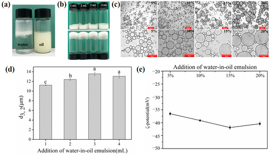 Figure 1a showed the visual appearance of primary emulsions in oil or water, which displayed that it was dispersed in oil and aggregated in the water phase. Therefore, the primary emulsion was identified as a water-in-oil (W/O) emulsion.