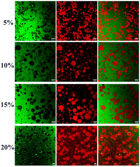 In this part, to explore the possibilities of W/O/W emulgels stabilized by SSPs at different oil–water ratios, the addition of W/O primary emulsion was gradually increased from 5% to 20% while keeping the concentration of SSPs. All fresh double emulsions exhibited gel-like behavior, and the droplet size gradually increased with the increasing addition of primary emulsions from optical micrographs (Figure 1b,c). The percentage of PGPR and internal water phase of W/O/W emulsion gel system increased with the increase addition of primary emulsion. Interestingly, previous studies have reported that the droplet size of the W/O emulsions reduced with increasing PGPR due to its lipophilic emulsification characteristics [27,28]. However, the droplet size of W/O/W emulgels increased from 11.23 to 13.07 μm with increasing primary emulsions from 5% to 20% (Figure 1d). This suggested that the primary emulsion might have influenced the tendency for the double emulsion to aggregate. Here, we proposed two possible reasons for the above phenomenon: (1) Competitive absorption of the excessive PGPR and protein (W2) at the external interface during the formation procedure of the double emulsion, which weakened the absorption efficiency of protein. (2) The osmotic pressure difference between the inner and outer aqueous phase was affected by the increase in the inner aqueous phase, which resulted in the diffusion of the inner aqueous phase to the outer aqueous phase [29]. Additionally, there was little change (non-significant) (p > 0.05) in the ζ-potential (Figure 1e) values in all double emulsions. It suggested that the interfacial composition of fresh emulsion with different W/O primary emulsion additions was relatively constant [30]. As shown from confocal laser scanning microscopy (CLSM) in Figure 2, it was obvious that the inner aqueous phase, the oil phase, and the outer aqueous phase of double emulgels were not dyed (bleak), Nile red dyed (red), and FITC dyed (green), respectively. Thus, the double emulgel was a type of water-in-oil-in-water (W/O/W) emulsion.