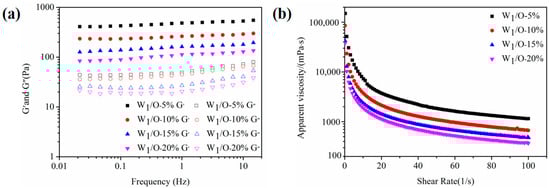 Rheological properties could provide some valuable information for the application of emulsions [25]. Frequency sweep curves and apparent viscosity curves were presented in Figure 3. For the frequency sweep test (Figure 3a), W/O/W emulgels prepared by adding different primary emulsions always had higher energy storage modulus (G′) than loss modulus (G′), which indicated that these emulsions were of a gel-like structure. In Figure 3b, the viscosity of all samples decreased as the shear rate increased, and the increased addition of W/O primary emulsion resulted in a lower viscosity. Therefore, the number of primary emulsions used to formulate the double emulgels had a major impact on their stability.