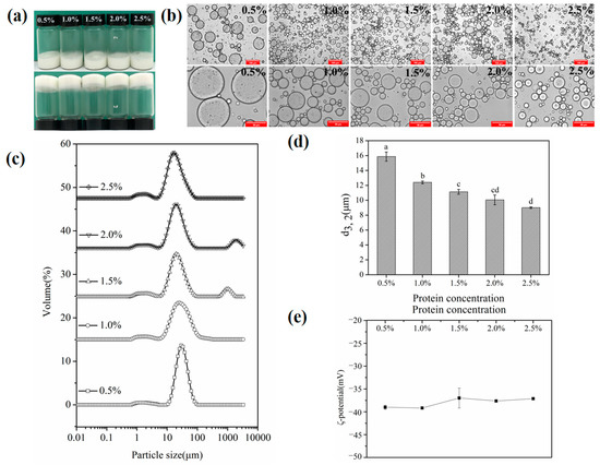 Visual appearance (a) and optical micrographs (b) (dilute the sample 10 times) (Scale bars, 100 μm and 50 μm, respectively) of W1/O/W2 emulgels (W1/O primary emulsion, 10%) by different concentrations of SSPs (W2, 0.5 wt%, 1.0 wt%, 1.5 wt%, 2.0 wt%, and 2.5 wt%). Particle size distributions (c), droplet size (d3,2) (d), and ζ-potential (e) of double emulsions with different SSP concentrations. Different letters in sub-figure (d) means significance difference (p < 0.05).