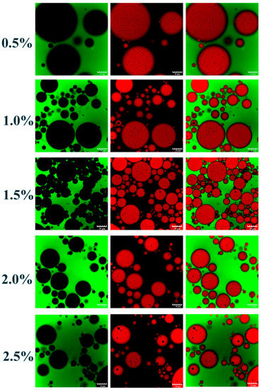 Emulsion droplet characteristics were important factors to judge the physical stability of the formed emulsion [32,33]. The particle size distribution and droplet size of the W1/O/W2 emulgels are illustrated in Figure 4c,d. The mean particle diameter decreased from 15.876 to 9.013 μm with increasing the SSP concentration from 0.5 wt% to 2.5 wt%. There was no significant (p > 0.05) change in double emulsion particle size between 2.0 wt% and 2.5 wt% SSPs. This effect could also be observed in particle size distribution. As the concentration of SSPs increased, the main peak around 10 μm shifted slightly to the left and decreased in intensity. These phenomena could be attributed to the sufficient number of SSPs adsorbing onto the oil–water interface to cover the larger interfacial area, resulting in the generation of smaller droplets [23]. According to earlier research, smaller oil droplets pack together more tightly, creating an emulsion system that is more stable [32]. Therefore, the stability of double emulgels was strengthened by increasing the SSPs concentration. Meanwhile, the ζ-potential values (Figure 4e) of emulsions were 40 ± 5 mV, which was slightly changed (p > 0.05) at different protein concentrations. The relatively high negative charge leads to strong electrostatic repulsion between the droplets to maintain good physical stability [1,34]. Additionally, the optical micrographs (Figure 4b) showed the obvious W/O/W structure features with small water droplets dispersed inside the larger oil droplets. The CLSM image (Figure 5) showed that the green on the left side of the image was the outer aqueous phase stained with FITC, and the red and black in the middle were the oil phase and inner aqueous phases. It further verifies the water-in-oil-in-water type of the W/O/W emulgels in Figure 4b.