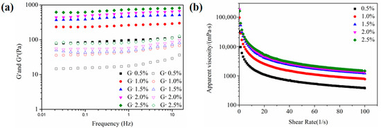 Rheological analysis was conducted to characterize the gelling behavior and viscoelastic property of emulsions. The frequency sweeps test of double emulgels is depicted in Figure 6a. All emulsions showed a higher storage modulus (G′) than the loss modulus (G′′), and there was no crossing-over between G′ and G′′. This phenomenon could be regarded as an elastic behavior, demonstrating the establishment of a gel-like network structure [35]. This might be because SSPs have a strong gel property, which could form a viscoelastic interface layer at the oil–water interface [36]. In addition, G′ gradually enhanced as the amount of SSP concentration increased, which indicated that the stability of the W/O/W emulgels system also gradually increased. The apparent viscosity test was depicted in Figure 6b, where the viscosity of the emulsion tends to decrease as the shear rate increases from 0 to 20 1/s, indicating the shear-thinning characteristic. These results manifested that the emulsion had a pseudo-plastic behavior [37]. Moreover, the apparent viscosity of double emulgels was increased with the increase in SSP concentration. This was mainly attributed to the decrease in particle size and the increase in the specific surface area of the emulsion, which leads to an increase in the number of emulsion droplets and droplet-droplet interactions [23]. There were similar research findings by Guo et al. (2020) [32].