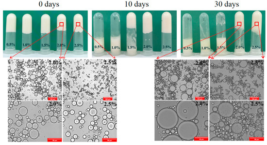 To determine the potential shelf life of double emulgels, the visual appearance (W2: 0.5 wt%, 1.0 wt%, 1.5 wt%, 2.0 wt%, and 2.5 wt%) and optical micrographs (W2: 2.0 wt% and 2.5 wt%) were evaluated by observing the stable W/O/W emulgels during storage at 4 °C for 0, 10, and 30 days, respectively. In the inverted visual appearance images of Figure 7, the gel-like structure could be found in fresh double emulgels (0 days). The double emulsion sample remained gel-like at 2.5 wt% of SSP concentration after 30 days of storage. In addition, the fluidity of the formed double emulgels increased and could flow freely at values of 0.5 wt% to 1.5 wt% of the SSPs when the storage time was increased from 0 to 10 days. A similar phenomenon could be confirmed in the optical micrographs. Compared to the fresh emulsion, the droplet size of double emulgels (W2: 2.0 wt%, 2.5 wt%) increased significantly (p < 0.05) after storage. This result revealed that aggregation of the emulsions occurred during storage. This could be due to the disruption of the gel state of the double emulsions, leading to oil-off, and thus affecting the stability of the overall emulsion system [30].