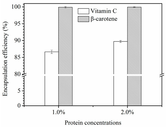 The ability of gel-like emulsions as delivery systems for the simultaneous encapsulation of hydrophilic and hydrophobic was analyzed. As shown in Figure 8, the encapsulation efficiency of vitamin C embedded in the W/O/W emulgels stabilized by 1.0% and 2.0% SSP was 87.3% and 91.2%, while the β-carotene was 99.7% and 99.8%, respectively. The encapsulation rate of β-carotene did not significantly increase (p < 0.05) when the concentration of SSPs in the external aqueous phase was raised from 1.0% to 2.0%, while the encapsulation rate of vitamin C did. This phenomenon further indicated that the stability of the double emulsion system increased with increasing SSP concentration. Compared with the previous study, the encapsulation efficiency of β-carotene was different to other delivery systems such as 6.0% bran wax (EE = 94.0%) [39], nanoemulsion (EE = 86.8%) [40], and zein microcapsule (EE = 91.7%) [41]. For vitamin C, the encapsulation rates of other delivery systems are as follows: whey protein-pectin (EE = 84.0%) [42], bovine serum albumin and pectin (EE = 65.3%) [43], and 2.0 mmol/g gelatin-sodium caseinate (EE = 97.0%) [44], and so forth. Therefore, the encapsulation efficiency of the double emulgel system, encapsulating vitamin C and β-carotene, was acceptable compared to other delivery systems for bioactive substances. Additionally, compared with β-carotene, there was a relatively low encapsulation efficiency of vitamin C in the W/O/W emulgels. This was mainly due to the hydrophobic environment between the inner and outer aqueous phases where more vitamin C was transferred to the outer aqueous phase during the preparation of W/O/W emulgels [9].