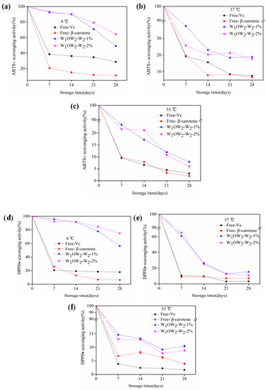 The retention of antioxidant ability of β-carotene and vitamin C in W1/O/W2 emulgels stored at 4, 37, and 55 °C for 28 days. ABTS+ (a–c) scavenging activity method. DPPH (d–f) scavenging activity method.