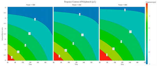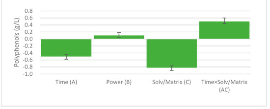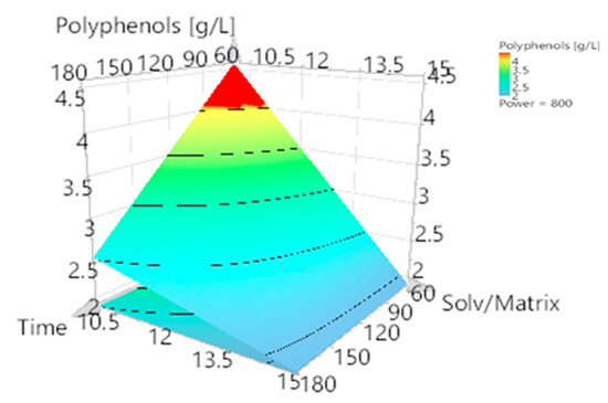 The experimental design employed in this work had three numerical factors: the power of the microwave, the extraction time, and the solvent/matrix ratio. As optimized response, the total phenol content (TPC) in the extract was measured. The phenol concentration was expressed as g of gallic acid equivalent (GAE)/L. The focus was on the phenol concentration in the extract because the objective was a ready-to-use product with the highest concentration of the active compound. In this study, the dependent variable was the TPC, and the independent variables were extraction time (A), power of the microwave (B), and solvent/matrix ratio (C).