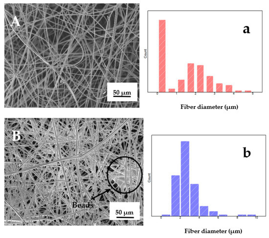 The morphology characterization of the fibers was performed using a scanning electron microscope (SEM) (Vega, Tescan, Brno, Czech Republic). Samples were prepared by taking a portion of the microfiber pads and placing it on a stub (specimen holder) to which a small strip of conductive carbon tape was previously applied. A secondary electron detector was used for the analysis by setting a beam acceleration voltage of 3 KeV. The morphology of the fibers was evaluated from the obtained images, and the identification of any morphological defects and dimensional analysis were performed using ImageJ software.