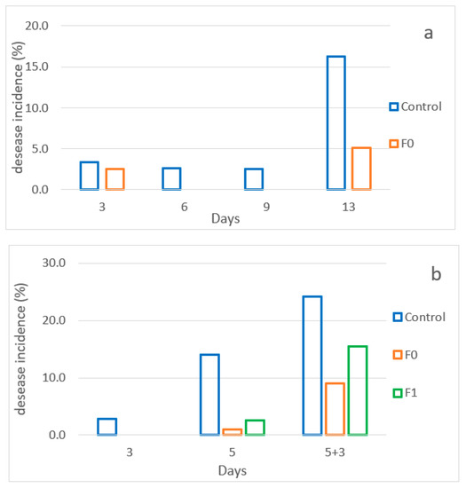 To test the possible antimicrobial effect of the pads, the incidence of diseased fruit on each date of analysis and for each treatment was evaluated. Diseased fruits are expressed as the % weight of total weight.