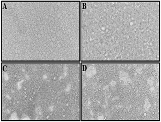 Optical microscope graphs of full-fat mayonnaise (A) and mayonnaise with (B) 25%, (C) 50%, and (D) 70% substitution of oil with Gurma melon pulp gel (GMPG).