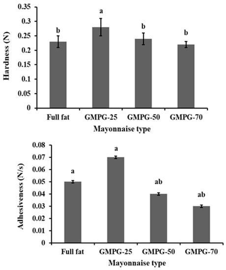 Throughout the texture study, mayonnaise hardness and adhesiveness were assessed in particular since they are essential textural properties impacting the workability and mouthfeel of the product and are connected to the flow and viscosity behavior of the system [33]. The hardness of all reduced-fat mayonnaises was greater than or equivalent to their full-fat competitors (Figure 2). GMPG-25, for instance, was substantially harder (0.28 N) than full-fat (0.23 N), GMPG-50 (0.24 N), and GMPG-70 (0.22 N), which were all comparable. It is possible to infer that the fat replacer employed in the creation of reduced-fat mayonnaises was capable of providing structural strength to the product despite the large fat reduction obtained. GMPG-25 was likewise shown to be much stickier than all other formulations, although GMPG-50 and GMPG-70 were less adhesive than the full-fat competitor.