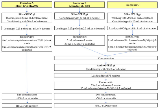 The method proposed by Moreda et al. [35] involves a first purification step using a 2 g silica SPE cartridge conditioned with n-hexane (30 mL), and the PAH fraction is eluted with 30 mL of n-hexane. After evaporation, the residue is loaded on a 5 g amino SPE cartridge before HPLC-FLD analysis (Figure 1—Procedure B). The combination of methods A and B resulted in a new procedure (Figure 1—Procedure C), which involves a first purification step using a 5 g silica SPE cartridge and a second one using a 5 g amino SPE cartridge. This new approach was used to analyze heavy PAHs in crude pomace oil and oil extracted from dried spent pomace.