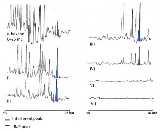 In the first discarded fraction (0–25 mL of n-hexane) numerous interferents were present in the elution zone of heavy PAHs—in particular, BbF, BkF, and BaP. The next two fractions (I: 0–3 and II: 3–6 mL), eluted with the n-hexane/toluene mixture (70/30, v/v), still showed the presence of interferents, particularly a peak that elutes just before BaP (highlighted in blue in Figure 3). Only from fraction III (6–9 mL), the BaP peak becomes prevalent on the interferent compound. An attempt to obtain a cleaner chromatogram by removing most of the interfering compounds was made by also removing the first 6 mL eluted with hexane/toluene (fractions I and II in Figure 3), thereby narrowing the fraction collected (fractions III, IV and V in Figure 3: from 6 to 15 mL eluted with n-hexane/toluene 70/30, v/v). Although this procedure resulted in a particularly interference-free HPLC-FLD chromatogram (Figure 2D), there was a drastic decrease in PAHs recoveries—in particular, BaA, with a recovery of 10.4% (n = 3, RSD%: 25.2)—making this route unfeasible. The new proposed purification approach (Figure 1—Procedure C) was tested in terms of recoveries, evaluated (n = 3) on a crude pomace oil sample fortified with a known amount of PAHs. The same spiked sample was also purified by using the procedure reported in Ref. [35] (Figure 1—Procedure B), previously applied to a strongly refined olive pomace oil sample. Recoveries higher than 79% were obtained for all heavy PAHs. Mean percentage recoveries, standard deviations, and relative standard deviations (RSD%) obtained are reported in Table 2.
