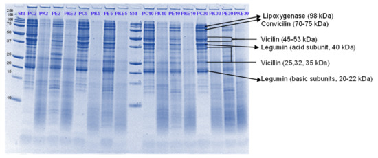 - Barac, M.; Cabrilo, S.; Pesic, M.; Stanojevic, S.; Zilic, S.; Macej, O.; Ristic, N. Profile and Functional Properties of Seed Proteins from Six Pea (Pisum Sativum) Genotypes. Int. J. Mol. Sci. 2010, 11, 4973–4990. [Google Scholar] [CrossRef]