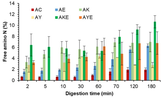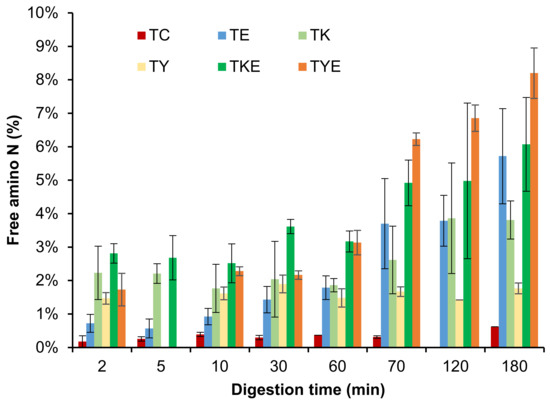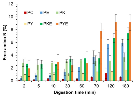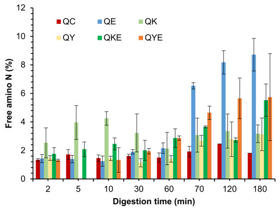 - CONTROL 1: no enzymes added but incubated in simulated oral juice for 2 min then simulated gastric juice at pH 3 for 2 or 5 or 10 or 30 or 60 min then simulated small intestinal juice at pH 7 for 10, or 60 or 120 min (referred to as ‘PC, QC, AC or TC for pea, quinoa, almonds and tofu, respectively)