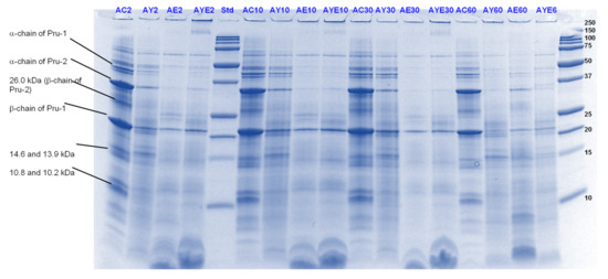 - Sathe, S.K.; Wolf, W.J.; Roux, K.H.; Teuber, S.S.; Venkatachalam, M.; Sze-Tao, K.W.C. Biochemical Characterization of Amandin, the Major Storage Protein in Almond (Prunus Dulcis L.). J. Agric. Food Chem. 2002, 50, 4333–4341. [Google Scholar] [CrossRef]