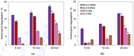 Student’s t-tests were performed to differentiate between the means, with 95% confidence interval (significance, p < 0.05, as indicated). The degradation curves were standardized to the degradation rate of the reference curve (as indicated) and compared to the reference curve using the similarity factor (f2) according to the guidelines of the US FDA guidelines (FDA/CDER, 1997). Calculations were performed using the OriginPro 2018 SR1 b9.5.1.195 software package (OriginLab), as described in our previous publication []. For anthocyanins determined by the HPLC method, the linear regression and correlation factor R2 were determined in Excel 2017 with the Data Analysis tool and ANOVA. LOD and LOQ were calculated according to the International Council for Harmonisation of Technical Requirements for Pharmaceuticals for Human Use (ICH) guidance on the validation of analytical procedures. LOD was expressed as 3.3xσ/S and LOQ as 10xσ/S, where σ is the standard deviation of response and S is the slope of the calibration curve.