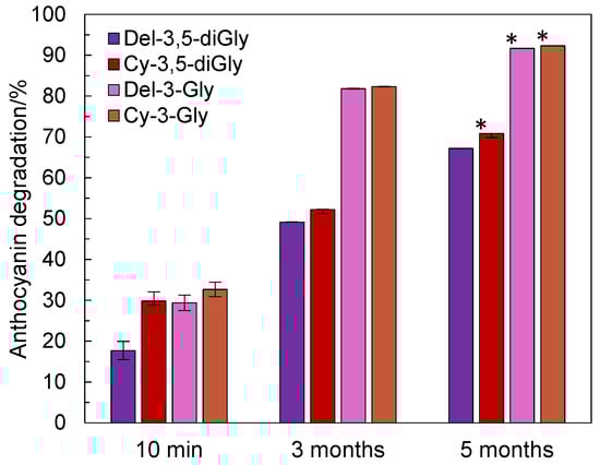 Thermal treatment of pomegranate juice on a bigger scale, on a homeware induction cooking plate in an open stainless still pot, revealed that after initial 10 min heating at 80 °C, degradation of delphinidin-3,5-O-diglucoside was lowest and highest for cyanidin-3-O-glucoside, 17.7% and 32.7%, respectively (Figure 2). After 3 and 5-month storage of thermally treated pomegranate juice, further degradation was observed for all analyzed anthocyanins. Delphinidin-3,5-O-diglucoside degradation was the lowest of all and ranged from 17.7% after initial 10 min heating at 80 °C to 49.1% and 67.2% after 3 and 5 months of storage of thermally treated pomegranate juice. In contrast to what we noticed in the short term (Figure 1), the highest and almost the same degradation were observed for monoglycosylated anthocyanidins (Figure 2).