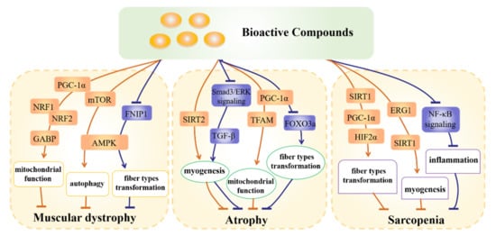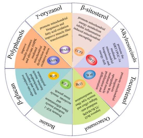 | γ-oryzanol | Male C57BL/6 mice | 14.78 mg/kg/d | PPARδ ERRγ | Upregulate mitochondrial biogenesis and promote fatty acid β-oxidation | Reduce muscle weakness, alleviate inflammation and enhance muscle strength | [121] |