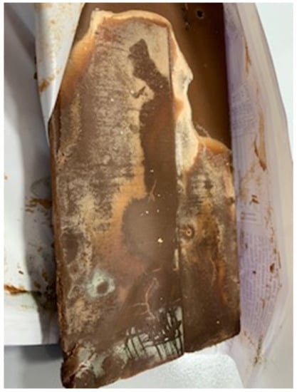 The second reason is the fat bloom phenomenon accompanied by changes in the crystallization of cocoa butter on the chocolate surface [], which introduces moisture to the surface. Most likely, the molds that contaminate the surface have taken advantage of this situation, developing and producing an evident patina.