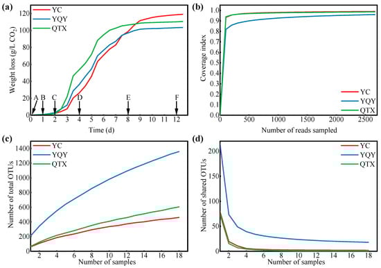 The fermentation process and sequencing evaluation. (a) The release of CO2 of three spontaneous fermentations. Samples were collected at six points marked with A (0 d), B (1 d), C (2 d), D (4 d), E (8 d), and F (12 d); (b) the rarefaction curve: X-axis, sequenced reads per sub-region; Y-axis, the percentage of discovered bacteria to predicted total bacteria per sub-region; (c) the observed numbers of bacteria per sub-region; (d) the shared numbers of bacteria among three sub-regions. OTUs, operational taxonomic units. Sequences with more than 97% similarity were classified as one OTU.
