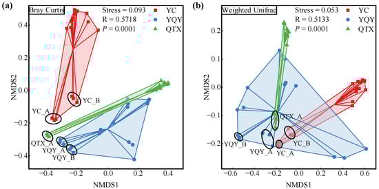 Bacterial community dissimilarities among different samples are shown by NMDS plots based on taxonomic (Bray–Curtis) and the phylogenetic (weighted UniFrac) distance (Figure 2) [38]. Taking the 18 samples in each sub-region, as a whole, the variation among different sub-regions was significant (stress < 0.1, p < 0.001). In addition, for different fermentation stages, stage A/B in YC and YQY, and stage A in QTX, can be separated from other stages, indicating that the composition of the bacterial community may change once the fermentation started.
