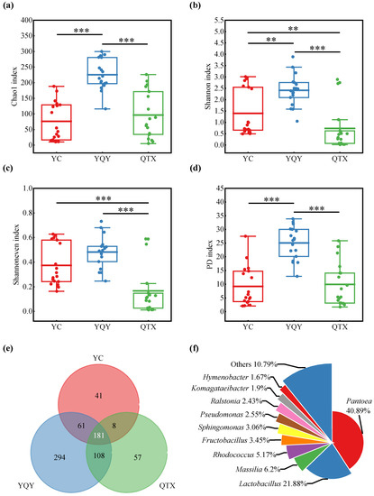 Illumina MiSeq sequencing platform can obtain more accurate annotation information at the genus level than at the species level. Therefore, the alpha diversity based on genera in three sub-regions was measured using non-phylogenetic (including Chao 1, Shannon, and Shannoneven index) and phylogenetic (Faith’s phylogenetic diversity, PD) indices [38]. According to Figure 3a–d, YQY had the highest levels of the four alpha diversity indices above, YC had the lowest values of Chao 1 and PD indices, and QTX had the lowest Shannon and Shannoneven indices. It could be further seen from Figure 3e that YQY not only had the most total number of bacterial genera (644) but the largest number of exclusive genera (294). In addition, there were 181 bacterial genera shared by the three sub-regions.