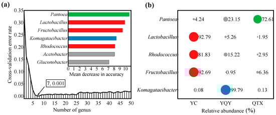 A RF supervised-learning model was used to reveal the core bacteria that could explain the strongest variation among samples from different sub-regions (Figure 4a) [3,33]. Seven bacteria genera were selected as biomarkers (Figure 4a), of which Pantoea, Lactobacillus, Fructobacillus, Komagataeibacter, and Rhodococcus were shared by the three sub-regions, with a relative abundance higher than 1% (Figure 3f). Therefore, they were preliminarily determined as the core bacteria in the spontaneous fermentation process of Cabernet Sauvignon wine in Ningxia. Figure 4b further showed their distribution in different sub-regions. 72.61% of Pantoea was from QTX, 99.79% of Komagataeibacter was from YQY, while Lactobacillus, Rhodococcus, and Fructobacillus were mainly from YC.