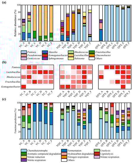 During wine fermentation, ethanol continues to accumulate and may have a considerable inhibitory effect on some bacteria [44]. As seen in Figure 9a, the changes in the relative abundances of both Pantoea and Rhodococcus during YC fermentation were significantly and negatively correlated with the increase in ethanol, suggesting that higher alcohol content may be one of the reasons for the decrease of these bacteria. However, Pantoea was not sensitive to ethanol stress in the YQY fermentation broth (Figure 9b), nor was Rhodococcus in QTX (Figure 9c). Although Komagataeibacter was sensitive to ethanol in the YC and YQY fermentations, a similar response was not observed during QTX fermentation (Figure 9b,c). Therefore, the responses of the above three core bacterial genera to ethanol stress needed further exploration.
