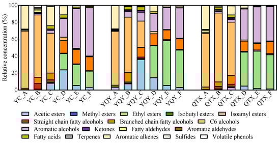 As for the YQY sub-region, the core AAB taxa Komagataeibacter was mainly distributed in the A–C stages, and then decreased rapidly. Moreover, Komagataeibacter only existed in the A stage of YC and the E stage of QTX. Another acetic bacterium, Gluconobacter, was also found in the early stages of YQY fermentation broth. Therefore, as the fermentation proceeded, their negative impacts on wine aroma quality may be limited. At the F stage of YQY, a large number of Oenococcus (relative abundance of 59.19%) were detected. Oenococcus is another kind of LAB leading the MLF process of wine, with O. oeni as the type species.