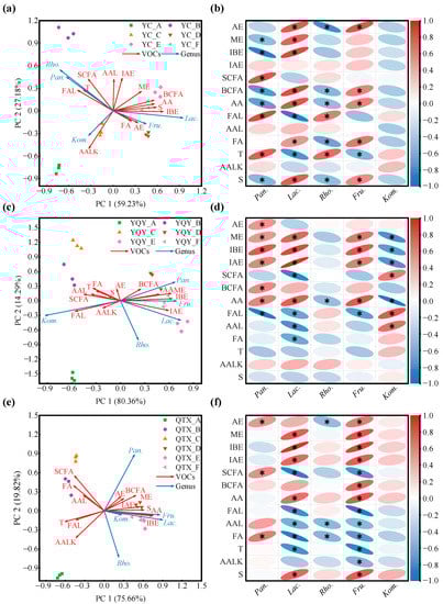 Correlation analysis between core bacteria and VOCs. RDA was used to summarize linear relationships between core bacteria and VOCs in (a) YC sub-region, (c) YQY sub-region, and (e) QTX sub-region. Arrow angle indicates the strength of the association between variables: Acute angle indicates strong concordance; obtuse angle, weak concordance. The different colors of arrows represent VOCs and genera. The color of each point shape corresponds to the color of each fermentation stage in the legend. A correlation heatmap was used to reveal significant linear correlations between each VOC and each genus in (b) YC sub-region, (d) YQY sub-region, and (f) QTX sub-region. A red ellipse with an asterisk represents a significantly positive correlation (Spearman’s rank test, p < 0.05), while a blue ellipse with an asterisk represents a significantly negative correlation (Spearman’s rank test, p < 0.05). AE: acetic esters; ME: methyl esters; IBE: isobutyl esters; IAE: isoamyl esters; SCFA: straight-chain fatty alcohols; BCFA: branched-chain fatty alcohols; AA: aromatic alcohols; FAL: fatty aldehydes; AAL: aromatic aldehydes; FA: fatty acids; T: terpenes; AALK: aromatic alkenes; S: sulfides. Pan., Pantoea; Lac., Lactobacillus; Rho., Rhodococcus; Fru., Fructobacillus; Kom., Komagataeibacter.