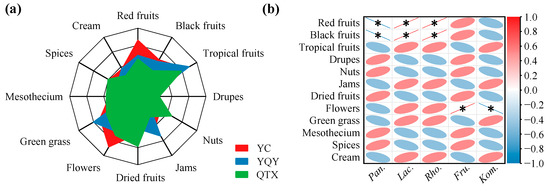 Correlation analysis between core bacteria and aroma profiles. (a) Aroma profile of spontaneously fermented grape wines from three sub-regions analyzed by QDA. (b) A correlation heatmap was used to identify significant linear correlations between each aroma descriptor and each core bacterial genus. A red ellipse with an asterisk represents a significantly positive correlation (Spearman’s rank test, p < 0.05), while a blue ellipse with an asterisk represents a significantly negative correlation (Spearman’s rank test, p < 0.05). Pan., Pantoea; Lac., Lactobacillus; Rho., Rhodococcus; Fru., Fructobacillus; Kom., Komagataeibacter.