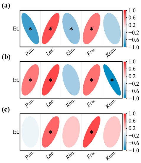 Correlation analysis between core bacteria and ethanol in (a) YC sub-region, (b) YQY sub-region, and (c) QTX sub-region. A red ellipse with an asterisk represents a significantly positive correlation (Spearman’s rank test, p < 0.05), while a blue ellipse with an asterisk represents a significantly negative correlation (Spearman’s rank test, p < 0.05). Et., ethanol; Pan., Pantoea; Lac., Lactobacillus; Rho., Rhodococcus; Fru., Fructobacillus; Kom., Komagataeibacter.