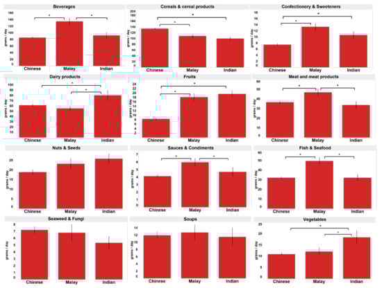 Ethnic differences in processed food category consumption by the three main ethnic groups are shown in Figure 1. The Chinese respondents consumed significantly more processed “cereals and cereal products” but significantly less “confectionery and sweeteners” and processed “fruits” than the Malay and Indian respondents (p < 0.05). In contrast, the Malay respondents consumed significantly more processed “fish and seafood”, “meat and meat products”, “sauces and condiments” and “beverages” than the Chinese and Indians (p < 0.05). On the other hand, the mean consumptions of “dairy products” (mean 80.3 g) and processed “vegetables” (mean 18.4 g) by the Indian respondents were significantly higher than those of the Chinese (mean 61.4 g, 10.9 g) and Malay (mean 55.3 g, 12.1 g) respondents (p < 0.05).