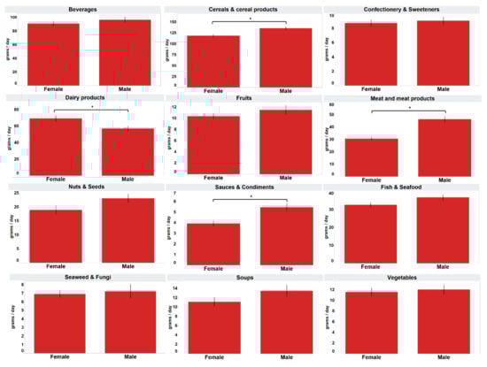 Figure 2 shows the mean daily intake of processed food categories by gender. Males consumed significantly more processed “cereals and cereal products” (mean 135.4 g), “meat and meat products” (mean 46.4 g) and “sauces and condiments” (mean 5.5 g) than females (mean 118.4 g, 30.7 g, 3.9 g) (p < 0.05). However, the mean consumption of “dairy products” was significantly greater for females (mean 69.3 g) than for males (mean 57.1 g) (p < 0.05).