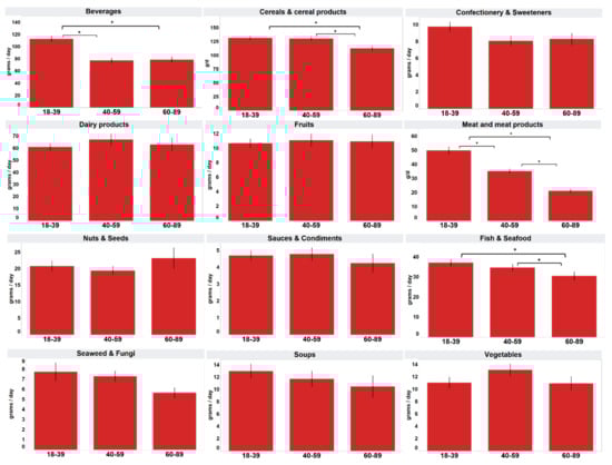 The mean consumption of processed “meat and meat products” among the three age groups was significantly different (p < 0.05), with decreasing consumption as age increased (Figure 3). Younger age groups including 18-to-39-year-old and 40-to-59-year-old respondents consumed significantly more “cereals and cereal products” (mean 131.4 g, 130.4 g) and “fish and seafood” (mean 37.2 g, 34.8 g) than the oldest age group comprising respondent of 60 to 89 years of age (mean 112.9 g, 30.5 g) (p < 0.05). The youngest age group of 18-to-39-year-old participants (mean 112.6 g) consumed significantly more “beverages” than the 40-to-59-year-old (mean 77.3 g) and 60-to-89-year-old age groups (mean 78.6 g) (p < 0.05).