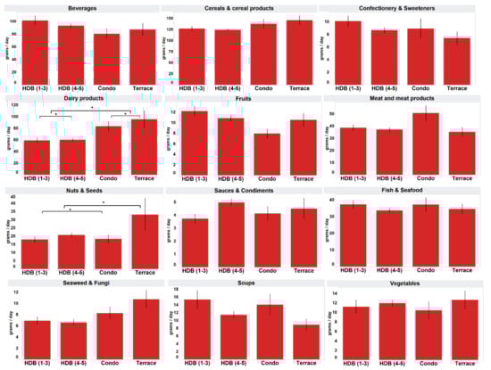 Mean daily intake of consumers analysed by housing type. * Mean values were significantly different as determined by ANOVA with Tukey’s HSD test for multiple comparisons (p < 0.05). HDB refers to public housing, with the number of rooms in the apartment reported in brackets.