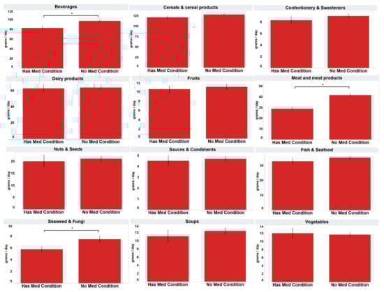 The respondents without existing health conditions consumed significantly more processed “meat and meat products” (mean 41.7 g), “seaweed and fungi” (mean 7.5 g) and “beverages” (mean 97.0 g) than those with at least one self-reported existing health condition (mean 29.0 g, 5.8 g, 82.6 g) (p < 0.05) (Figure 5).